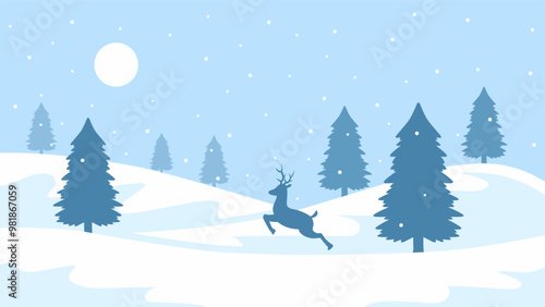 Naklejka premium Landscape illustration of winter hill with pine trees and a deer