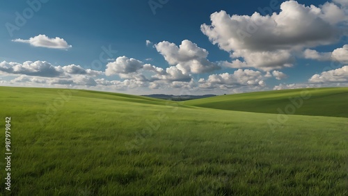 © Phoneutria, Fototapeta premium Landscape image featuring a vast, gently rolling green hill under a clear vibrant blue sky, nature background