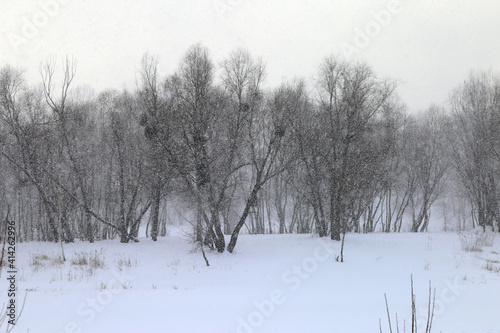 © Сергей Луговский, Obraz premium landscape in a blizzard with trees