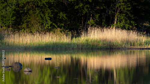 © Andreas Bergerstedt, Fototapeta premium Landscape in early morning light with calm water, rocks and reeds reflecting in water at sunrise