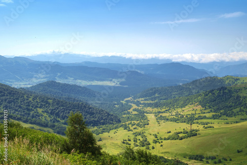 © Luka, Fototapeta premium Landscape in green meadows, trees and mountain