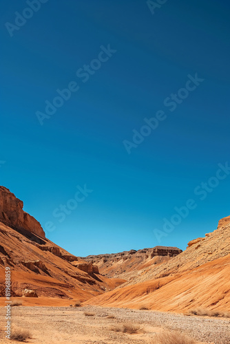 © DOC, Fototapeta premium landscape in the desert with orange rocks, desert canyon, sandstone mountains, clear blue sky, photorealistic // ai-generated