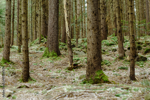 Naklejka premium Landscape in the forest in the mountains. Rocks and tree trunks covered in moss