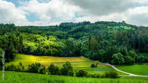 Naklejka premium landscape in the summer. Agricultural field, trees, roads, sky and clouds in Switzerland..