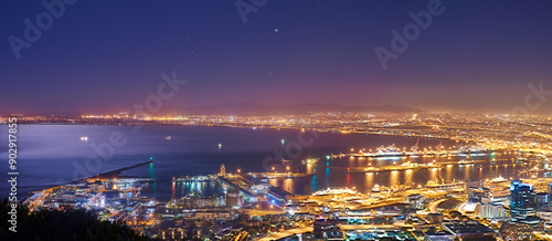 Obraz premium Landscape, night and skyline or cityscape and sea for travel, lights or urban...