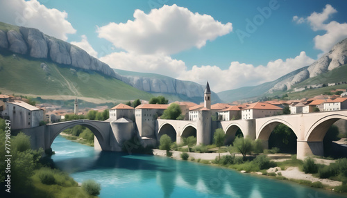 Fototapeta premium Landscape of a bridge over a mountain river. 3d rendering. Generative AI