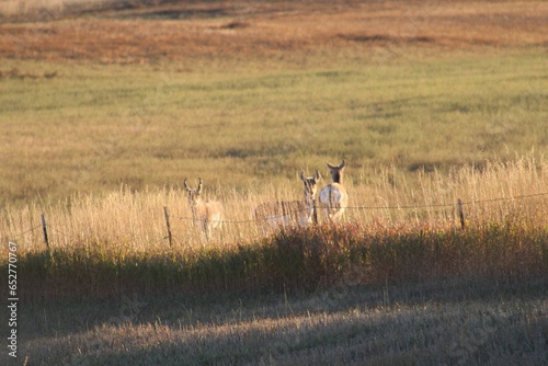 © Devon Mcginnis/Wirestock Creators, Naklejka premium Landscape of a herd of pronghorns grazing in a field under the sunlight