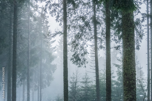 Naklejka premium Landscape of a misty and gloomy forest in the Vosges mountains in winter.