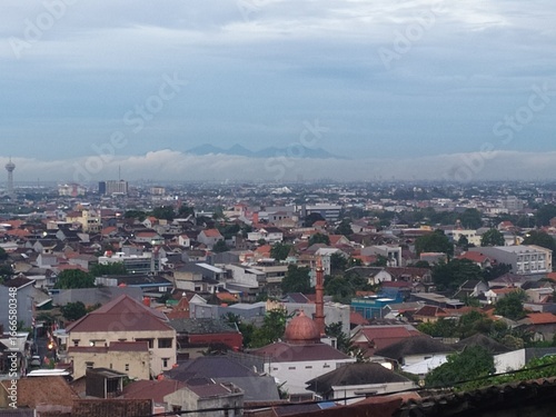 © Ari Djunaedi, Obraz premium landscape of a small town with a mountain backdrop
