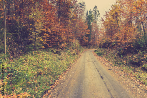 Obraz premium Landscape of autumn forest, road covered with fallen leaves from deciduous trees, toned image