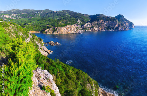 © Sodel Vladyslav, Fototapeta premium Landscape of beach in close bay with crystal clear azure water.