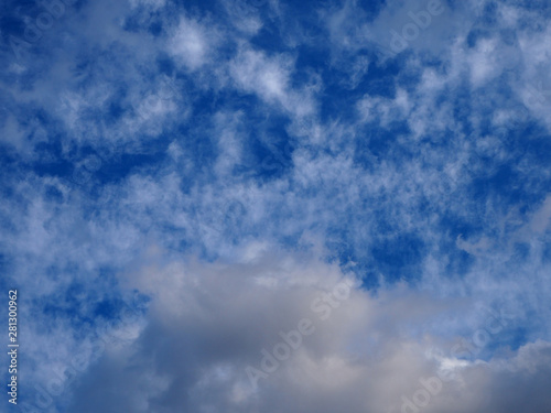© olympuscat, Fototapeta premium Landscape of beautiful blue sky covered with light thin fluffy white clouds and a thundercloud coming from below. Cloudscape bottom up view. Natural cloudy blue sky on day time abstract background.