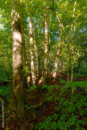 Fototapeta premium landscape of beech forest in summer. beautiful nature background with green...
