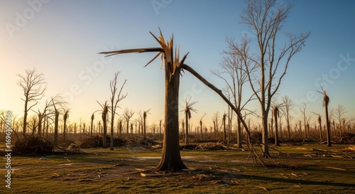 Obraz premium Landscape of devastation featuring snapped and splintered trees after a...
