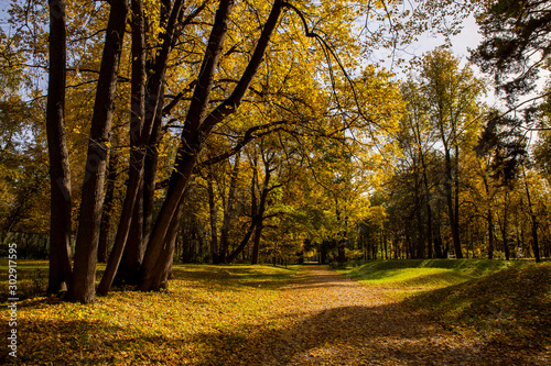 Naklejka premium Landscape of Golden autumn in the Park where there are old oaks. Kuskovo,...
