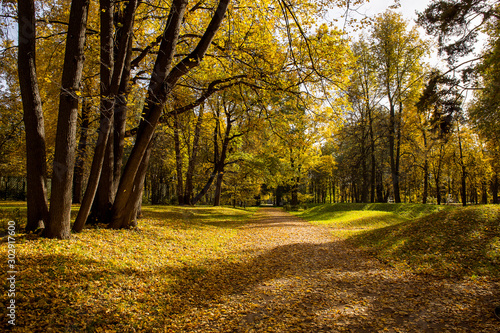 Fototapeta premium Landscape of Golden autumn in the Park where there are old oaks. Kuskovo,...