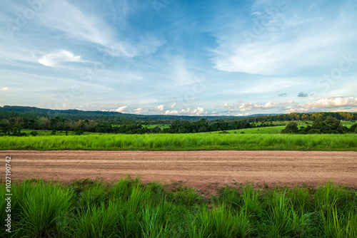 © yotrakbutda, Fototapeta premium Landscape of gravel road in countryside with meadow. Road in rainy season. Side view of dirt road in forest with sunset. road background.