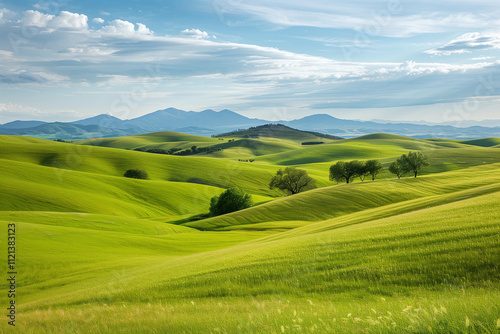 © tayyaba, Fototapeta premium landscape of green fields with beautiful clouds floating over blue sky illustrating elements of natural beauty