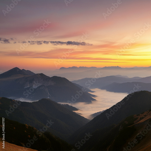 Obraz premium Landscape of green mountains with foggy valley mist between high peaks red to pink sky scenic sunset or sunrise