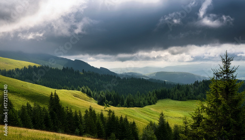Obraz premium Landscape Of Hills And Forest On Cloudy Day