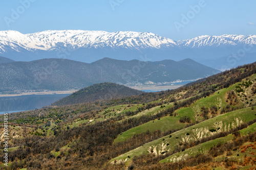 Fototapeta premium Landscape of Little Prespa Lake, Municipality of Devol, Greece.