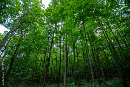 © Casa.da.Photo, Obraz premium Landscape of lush green forest with sugar maple trees in summer. Quebec, Canada