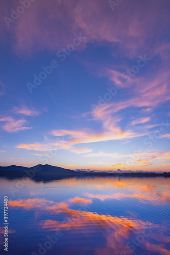 © narongcp, Fototapeta premium Landscape of mountains and lake at sunset and clouds reflected in the water.