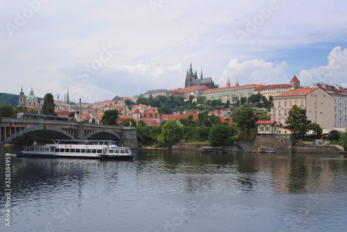 © Hanna, Naklejka premium Landscape of Prague, Czech Republic on a sunny day. View of St. Vitus Cathedral. In the foreground is a boat on the Vltava river .