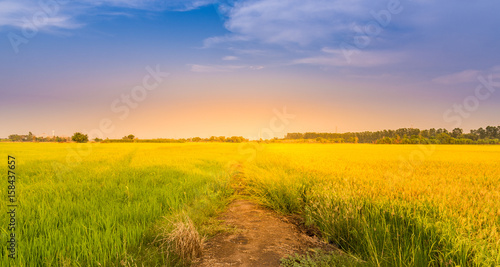 Obraz premium Landscape of rice field and sky during sunset in summer.