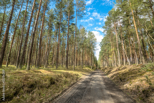 © alicja neumiler, Obraz premium Landscape of road through pine forest in spring sunny day