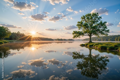 © JetHuynh, Obraz premium Landscape of still Lake with Perfect Tree Reflection at the sunrise or sunset