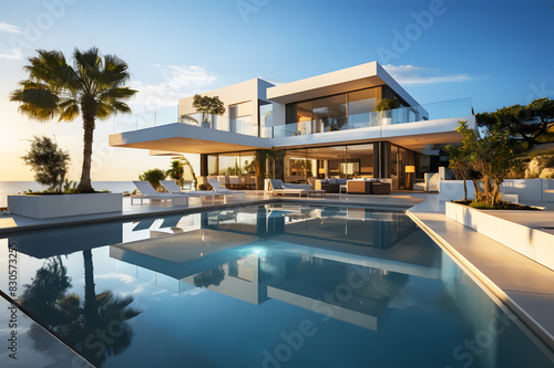 © Lucky, Fototapeta premium Landscape of swimming pool beautiful and structure of Villa or hotel house modern by sea amidst bright sunshine and clear skies white architecture . Luxury travel summer concept, vacation destination.
