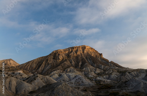 Fototapeta premium Landscape of Tabernas Desert, Almeria, Spain, in the morning with sunlight and shadow, against cloudy sky
