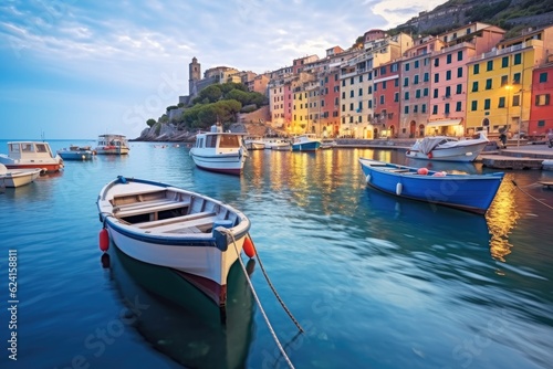 © visoot, Obraz premium Landscape of the harbor with colorful houses and the boats.