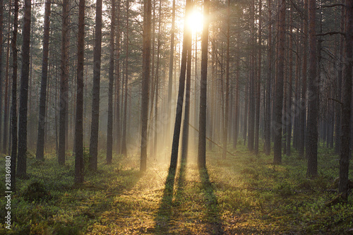 © morelena, Fototapeta premium Landscape of the morning forest, bathed in sunlight passing through the trees