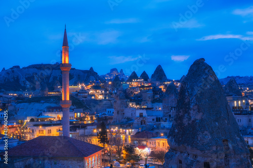© Lana Kray, Naklejka premium Landscape of the night city of Goreme, Cappadocia Turkey, overlooking the minaret and houses in the rocks, .blue hour
