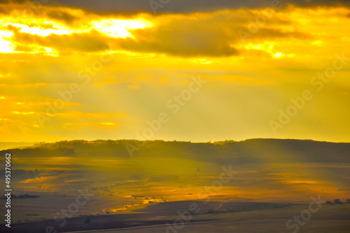 © Lyubov, Naklejka premium landscape of the plain from a high point with sunlight in warm colors. The concept of background, wallpaper, paintings, enjoying nature.