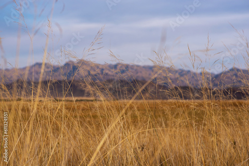 © eskstock, Obraz premium Landscape of the Tibetan Plateau. Yellow wild grass against the backdrop of a mountain range. An amazing view of a desolate plain with dry grass in the foreground and mountains in the distance.