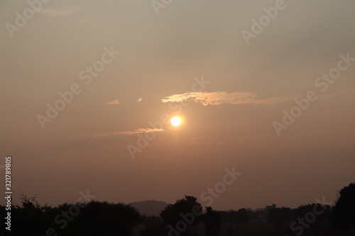 © Dinesh, Fototapeta premium landscape on sunrise with sun and sunlight from yellow clouds in blue sky