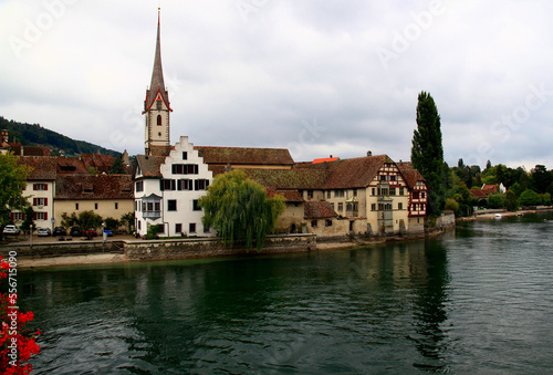 © Kateryna M, Naklejka premium Landscape overlooking the Rhine river and part of the old town with the monastery of St. George in Stein am Rhein, northern Switzerland