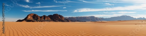 © Katsyarina, Fototapeta premium Landscape overlooking the sandy desert. Natural background with copy space. Minimalistic landscape with sand dune