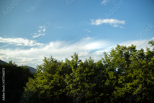 Fototapeta premium Landscape patterned with rich green trees and bright blue skies