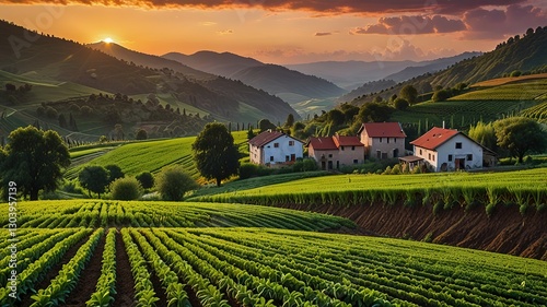 © Herlina, Naklejka premium Landscape photograph capturing a lush agricultural scene at sunset.