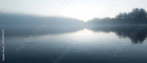 Fototapeta premium Landscape photograph of a calm lake. the water is still and reflects the trees on the right side of the image. the trees are silhouetted against the sky, creating a peaceful and serene atmosphere.