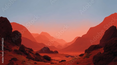 © CYBERPINK, Naklejka premium Landscape photograph of a desert-like area with red mountains in the background. the sky is a gradient of orange and pink hues, with the sun setting in the distance.