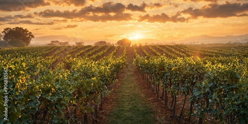 © Panuwat, Naklejka premium Landscape photograph vineyard sunset sky filled orange yellow Sc