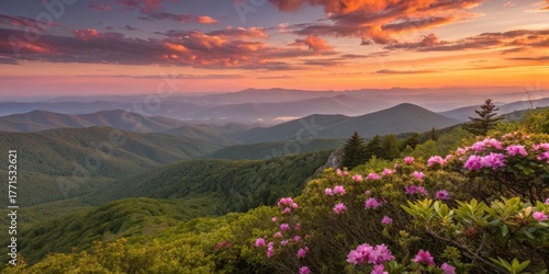 Fototapeta premium Landscape photography of mountain range at sunset with flowers in foreground...