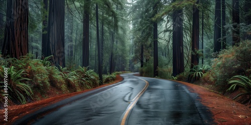 Naklejka premium Landscape Photography, Road Through Redwood Forest in Foggy Conditions