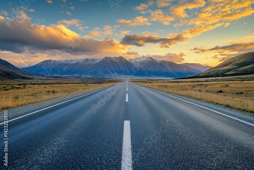 © Maryna, Fototapeta premium Landscape Road: Sunset View of Asphalt Road Cutting Through Mountainous Background