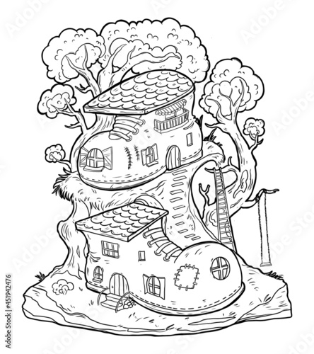 © kateja, Fototapeta premium Landscape scene with trees and shoes houses. Cartoon vector illustration